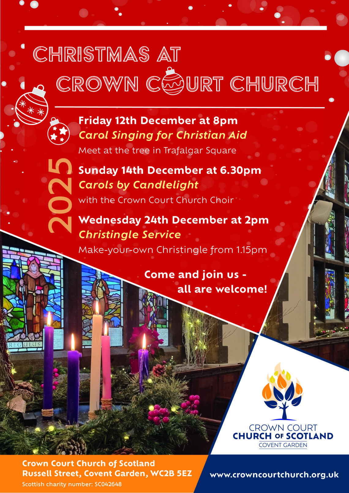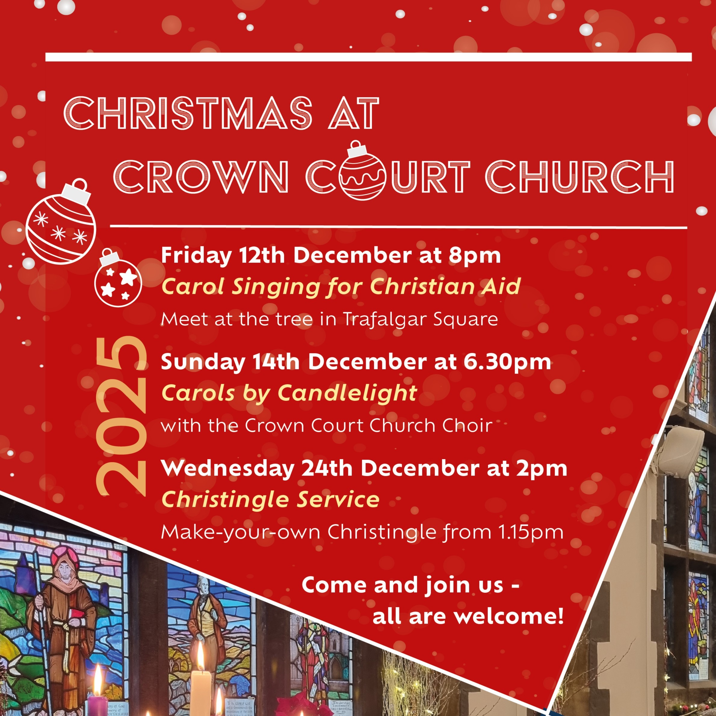 Our annual service of lessons and traditional carols with the Crown Court Church Choir, led by the Reverend Alistair Cumming, and followed by festive refreshments.